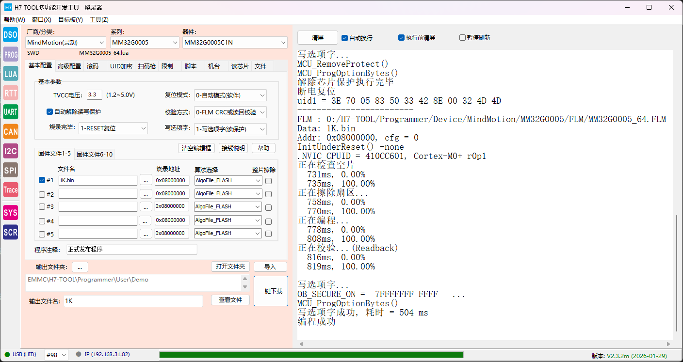 近期已经自制了STM32H7全系列,STM32U5全系列,国民技术N32G003,N32G031, N32G43x,N32G030,N32G033,N32G401,复旦微FM33LE,FM33LG,FM33LC, FM33FR系列,华大电子的CIU32F003,CIU32D655系列,凌欧的LKS32MC03X,LKS32MC45x,LKS32MC05x,LKS32MC08x,武汉芯源CW32L010,CW32L011, CW32L012,领芯微LCM32F067提供Flash保护支持